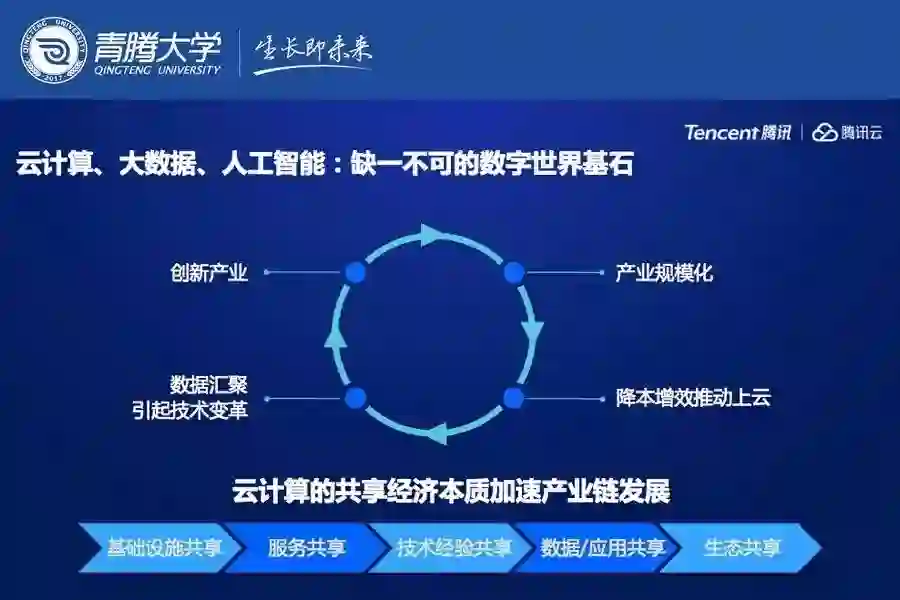 “云计算+大数据+AI”,未来也许还会接入更多新科技,比如量子计算、AR、VR等,从而帮助企业实现数字化转型升级。而我们腾讯云在做的,以云服务的方式,将更多智能科技接入给企业,帮助企业连接智能未来。