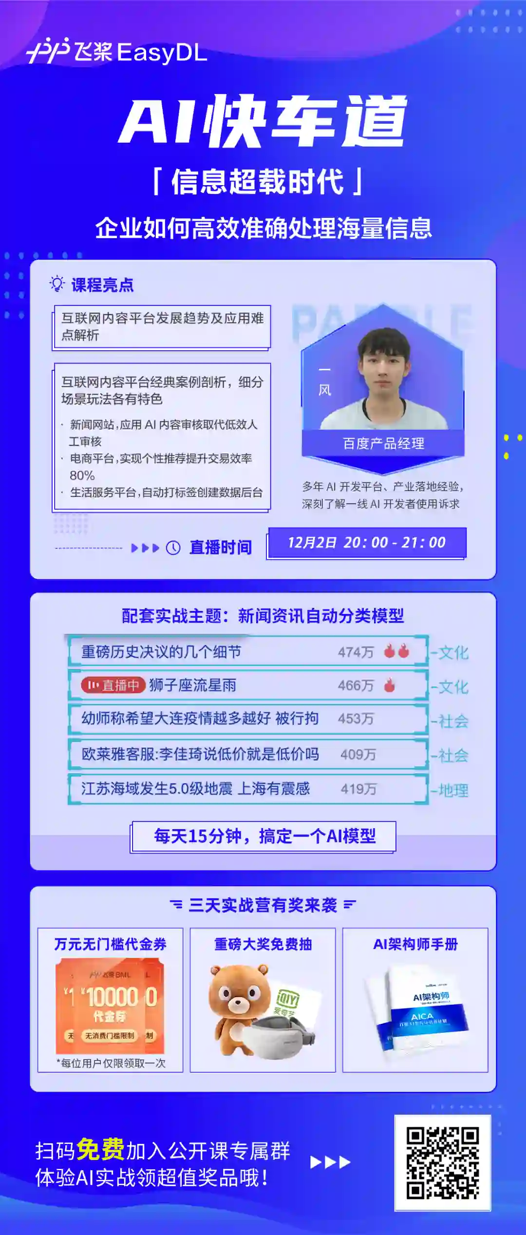 直播中将带着大家从技术到应用,解析AI在互联网平台各场景的落地要点,并解读飞桨EasyDL用户中各类互联网平台案例:新闻资讯平台、电商平台以及生活服务平台等,或许从案例中你会收获更多灵感。