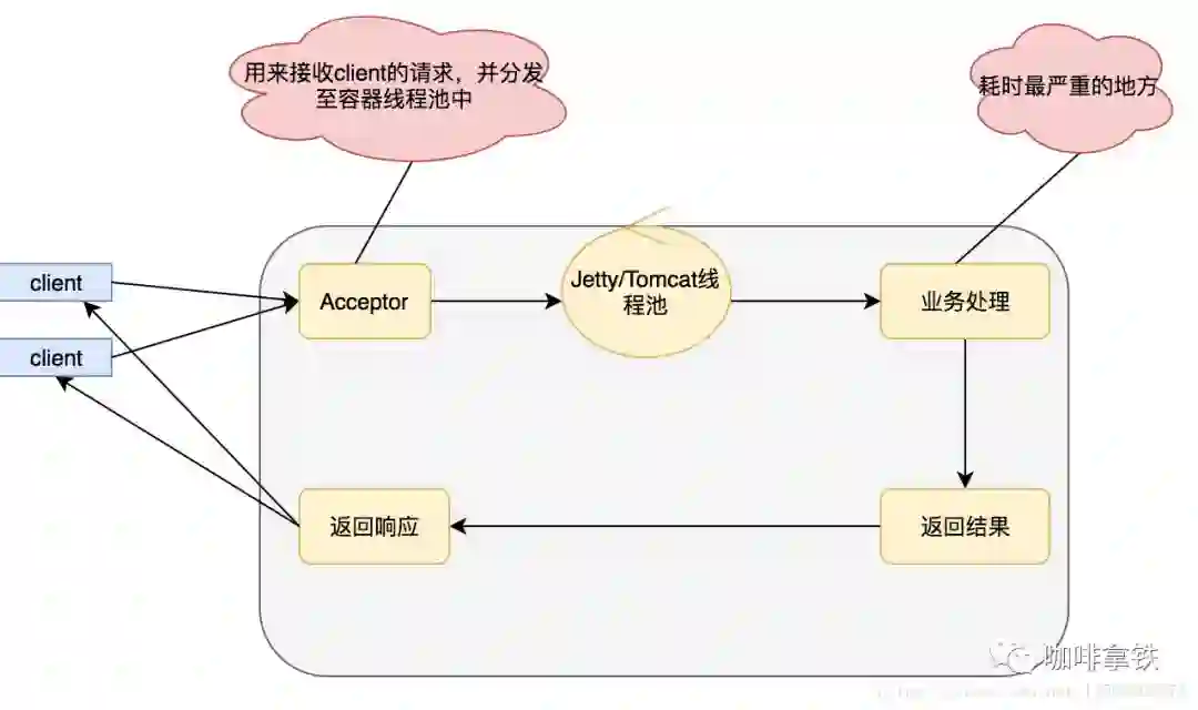 缺点在于,业务逻辑线程和servlet容器线程是同一个,一般的业务逻辑总得发生点IO,比如查询数据库,比如产生RPC调用,这个时候就会发生阻塞,而我们的servlet容器线程肯定是有限的,当servlet容器线程都被阻塞的时候我们的服务这个时候就会发生拒绝访问,线程不然我当然们可以通过增加机器的一系列手段来解决这个问题,但是俗话说得好靠人不如靠自己,靠别人替我分担请求,还不如我自己搞定。所以在servlet3.0之后支持了异步化,我们采用异步化之后就会变成如下: