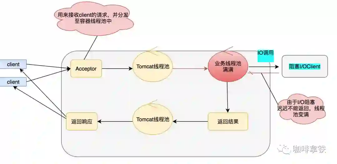 上面我们介绍了serlvet的异步化,相信细心的同学都看出来似乎并没有解决根本的问题,我的IO阻塞依然存在,只是换了个位置而已,当IO调用频繁同样会让业务线程池快速变满,虽然serlvet容器线程不被阻塞,但是这个业务依然会变得不可用。