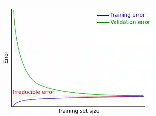 这告诉我们,在实际中性能最好的模型会收敛于某个不可约误差,而不是理想的误差值(对于 MSE,理想的误差值是 0;我们将会看到,其他的误差值会有和 MSE 不同的理想值)。