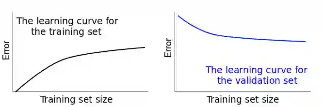 因此我们会监控两个误差得分:一个针对训练集,另一个针对验证集。如果我们把两个误差得分随着训练集的改变画出来,最终我们会得到两个曲线。它们被称为学习曲线。