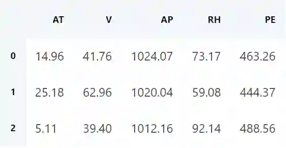 PE 这一列是目标变量,它描述的是每小时的电能输出净值。其他所有变量都是潜在特征,每个变量实际上都是每小时的平均值(而不像 PE 一样是净值)。