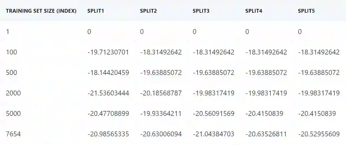 应该注意,每个特定大小的训练集都会训练一个新的模型。如果你使用了交叉验证,也就是我们在本文中使用的方法,那么每个训练集大小会训练出 k 个不同的模型(k 是交叉验证的次数)。为了节省代码的运行时间,将交叉验证设置到 5-10 是比较现实的。