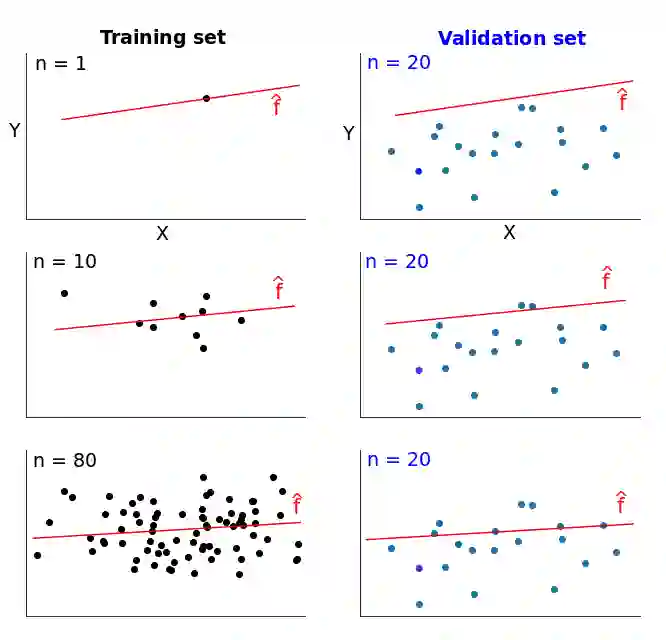 假设我们拥有一些数据,并且将它们分割成训练集和验证集。我们从训练集中拿一个例子(对,仅用一个样本)来训练模型,并用它来估计一个模型。然后我们在验证集上衡量这个基于一个训练样本的误差。在训练集上的误差是 0,因为它能够很容易地适应一个数据点。然而,在验证集上的误差会特别大。这是因为,这个模型是在一个样本上建立的,它几乎不能够准确地泛化到之前没有见过的数据上。