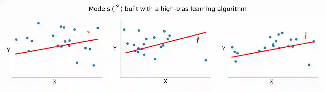 反过来也说得通:bias 越高,variance 越低。一个高 variance 的模型构建的简单模型通常是不能很好适应数据集的。当我们改变数据集的时候,从高 bias 的算法得到的模型 f^ 通常不会有很大不同。