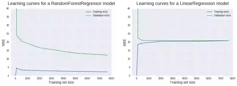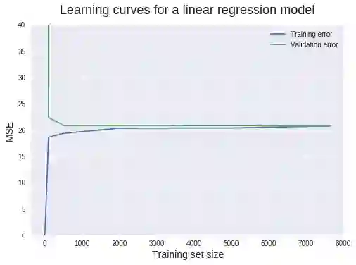 从 500 个数据点开始,验证集的 MSE 能够保持大致不变。这给我们一个重要信息:增加更多的训练数据点也不会带来更好的模型。所以与其浪费时间(金钱)来收集数据,我们更需要的是做点其他事情,例如尝试一下能够构建更加复杂模型的算法。