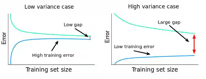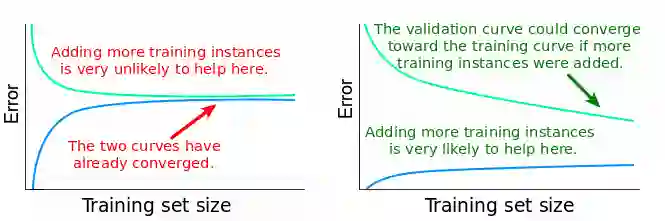 正如我们之前观察到的一样,如果 variance 比较大,那么说明模型过于拟合训练数据了。当模型过拟合的时候,它在泛化到从未见过的数据上时会存在问题。当这样一个模型分别在训练集和验证集上测试的时候,训练误差会比较低,验证误差通常会比较高。当我们改变训练集大小的时候,这种模式会继续存在,训练集和验证集之间的差距会决定这两个学习曲线之间的距离。