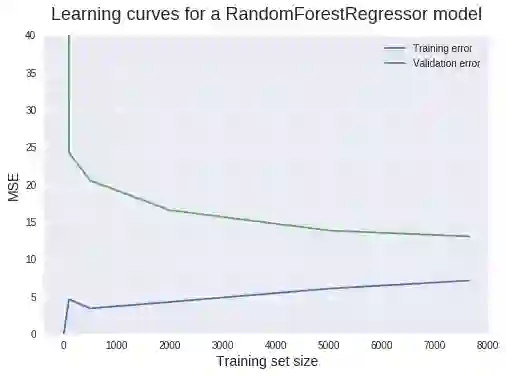 plt.ylim(0,40)### Plotting the two learning curves ###from sklearn.ensemble import RandomForestRegressor