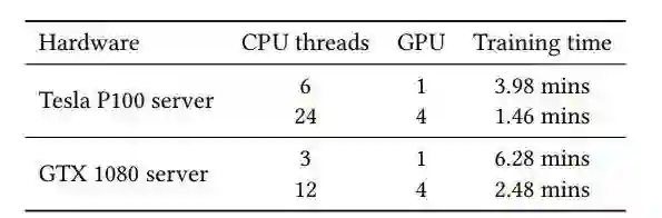 Tesla P100 服务器和 GTX 1080 服务器两种硬件配置下的 GraphVite 训练时间。