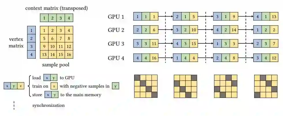 对于 n 个 GPU,他们将顶点行和语境行分别划分为 n 个分块(见图 2 左上角)。