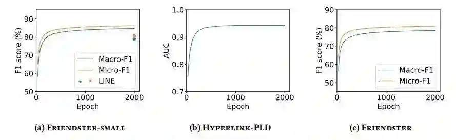 对于 Friendster 数据集,研究人员绘制了 LINE 的结果以供参考。