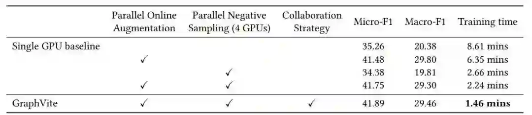 表 5:更大数据集上的时间结果。研究人员只用 4 个 GPU 评估了 Hyperlink-PLD 和 Friendster 数据集,因为它们的嵌入矩阵无法读入单个 GPU 的内存。