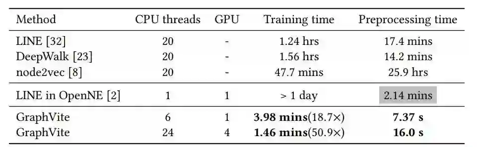 表 3:Youtube 数据集上不同系统的时间结果。预处理时间指的是训练前的所有开销,包括网络输入和离线网络增强。需要注意的是,OpenNE 的预处理时间没有可比性,因为它缺少了网路增强阶段。GraphVite 的加速比基于当前最快的系统 LINE 进行计算。
