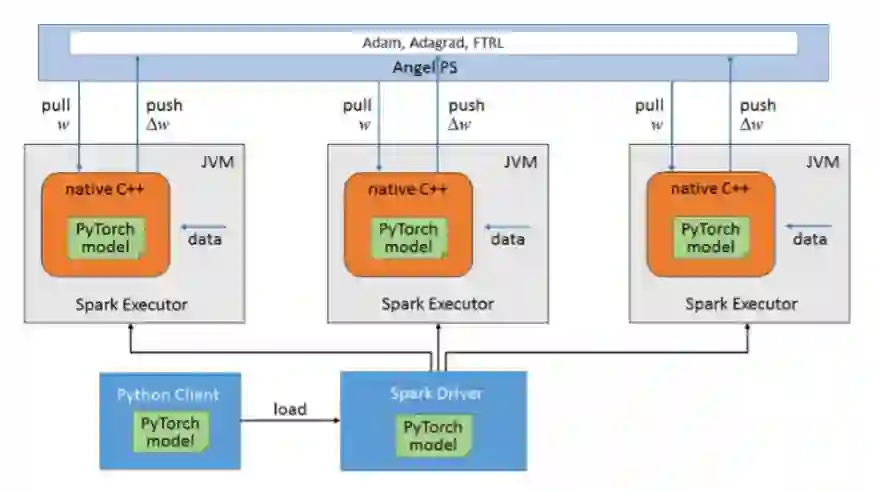 · Spark Worker:读取计算数据,同时从PS上拉取模型参数和网络结构等信息,然后将这些训练数据参数和网络结构传给PyTorch,PyTorch负责具体的计算并且返回梯度,最后Spark Worker将梯度推送到PS更新模型