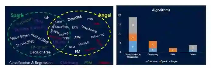 从图9中可以看出,Spark On Angel中的算法与Spark中的算法存在显著的不同,如:基于Spark On Angel的算法主要是针对推荐和图领域,然而Spark中的算法更通用。