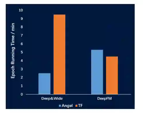 由于结合了PyTorch和Angel的优点,PyTorch On Angel在算法性能方面有很大的优势:对于推荐领域常见的深度学习算法,性能可以达到TensorFlow的4倍以上;对于GNN算法,性能也远好于目前业界开源的同类型平台(具体的性能数据会在开源社区陆续公开)。下图是在公开的数据集criteo kaggle2014(4500万训练样本,100w特征)上做的对比测试: