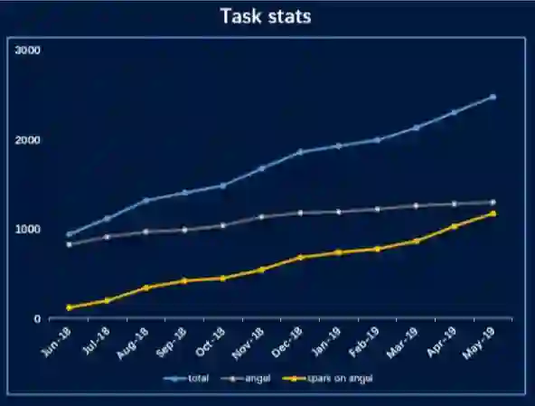 从2017年6月开源以来,Angel受到了较多的关注,目前在GitHub上Star数超过4200,Fork数超过1000。Angel项目目前总共有38位代码贡献者,其他包括8位committer,他们总共提交了超过2000个commit。