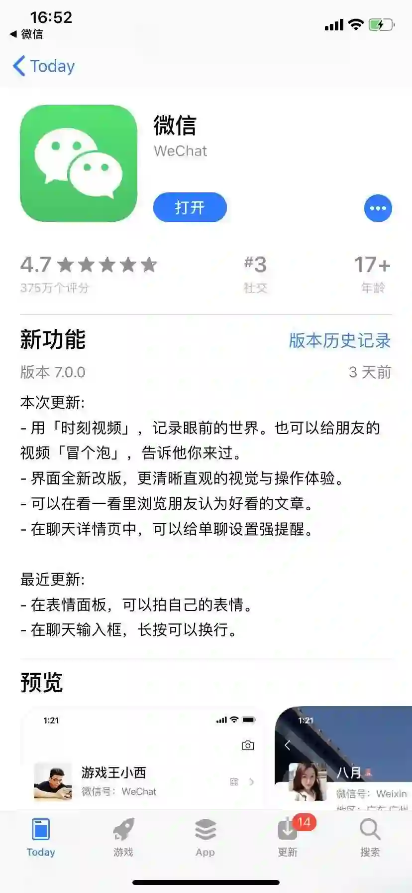 微信5.0上线,添加了表情商店和游戏中心,扫一扫功能全新升级,可以扫街景、扫条码、扫二维码、扫单词翻译、扫封面。