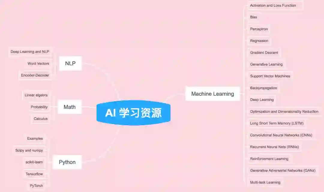 为什么说这里面的内容是自己在所有的资源中挑选出来最好的?首先这份收藏清单并不是把在网上可以搜索到的所有学习资料直接罗列,作者主要从机器学习、NLP、Python 和数学四部分的内容介绍给大家,并且每个部分细分了不同的主题,每个主题有 5~6 个学习资源,力求从不同角度与不同的呈现形式(如有教程、幻灯片、博客文章等)使内容具有多样性。