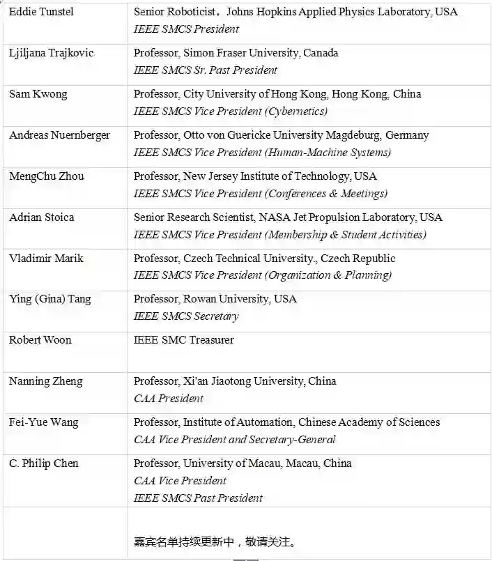 请您于5月31日前将参会回执(附件)以电子邮件提交至会务联系人(caa@ia.ac.cn)。IEEE SMC学会重量级嘉宾亲临会场,参会名额有限,欲报从速。