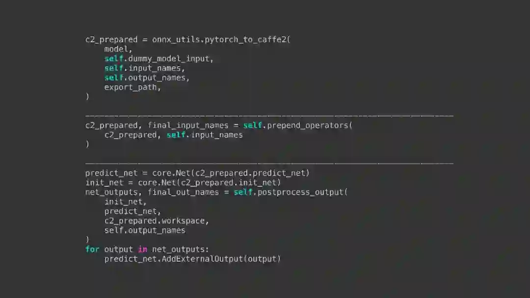 这个代码示例展示了如何使用 ONNX 将模型导出至 Caffe2,预先添加一个运算符(如 string2id),然后执行任何必要的后处理。