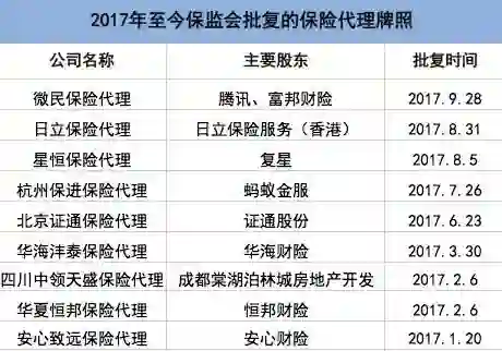 据保监会官网信息统计,2017年以来,保监会共批复了9家保险代理公司资格(如下图)。除了微民保险,7月,蚂蚁金服旗下的杭州保进保险代理有限公司也获得了保监会批准。