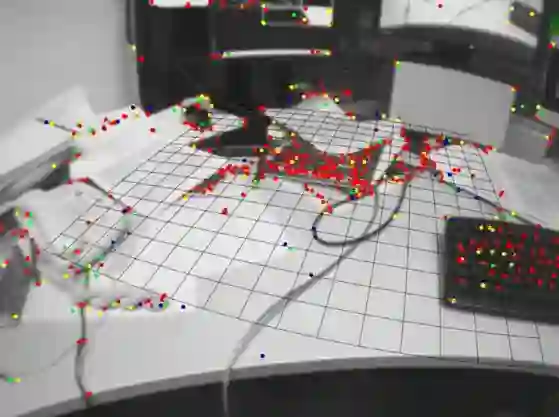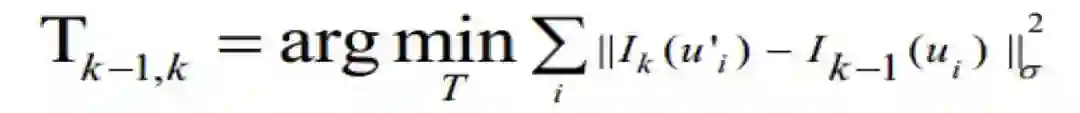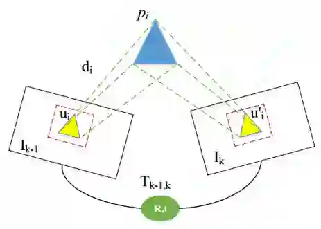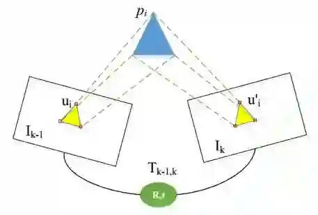 其中 ui 为 Ik-1 中任意像素点,它投影到空间点的坐标为 Pi, u′i是 Pi 投影到 Ik 上的坐标。之后利用中间层的数值来估计周围环境的三维模型和相机运动。