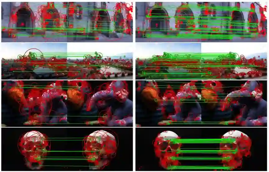 特征匹配对比图中左列为SIFT匹配结果,右列为LIFT。绿色线条代表正确匹配,红色圆圈代表描述子区域,可以看到,LIFT得到了比SIFT更稠密的匹配效果。