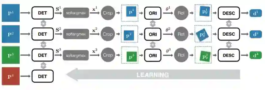 LIFT(Learned Invariant Feature Transform)由三个部分组成:Detector,Orientation Estimator和Descriptor。每一个部分都基于CNN实现,作者用Spatial Transformers将它们联系起来,并用soft argmax函数替代了传统的非局部最大值抑制,保证了端到端的可微性。
