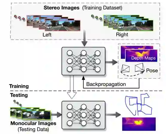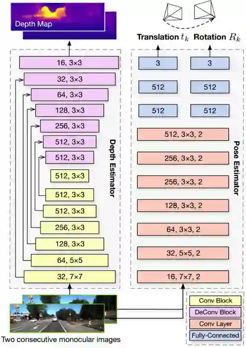 UnDeepVO有两个显著的特点:一个是采用了无监督深度学习机制,另一个是能够恢复绝对尺度。UnDeepVO在训练过程中使用双目图像恢复尺度,但是在测试过程中只使用连续的单目图像。该文的主要贡献包括以下几点: