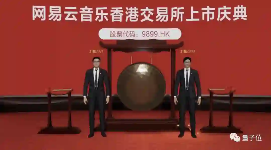 最后,加上背后线下画面的真实画面,在此次网易云音乐“元宇宙”上市现场,三位丁磊跨时间、跨空间,共同完成了敲钟的动作。