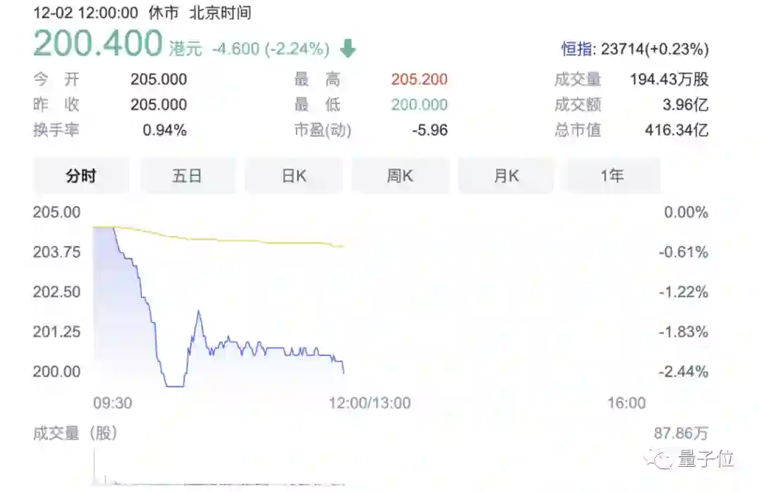 然而在开盘之后,网易云音乐跌破发行价,截至北京时间12:00,报200.4港元,跌幅2.24%。