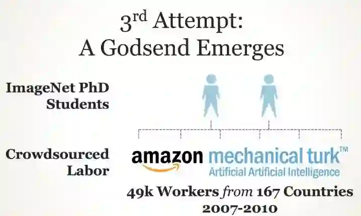 通过亚马逊 mechanical turk 平台,来自 167 个国家的 4 万 9 千名工作者用 3 年(2007-2010)努力成就了 ImageNet。