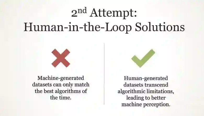 第二种方式:人类参与的解决方案。机器生成的数据集只能匹配一时的最佳算法,而人类生成的数据集超越了算法限制,能够生成更好的机器感知。