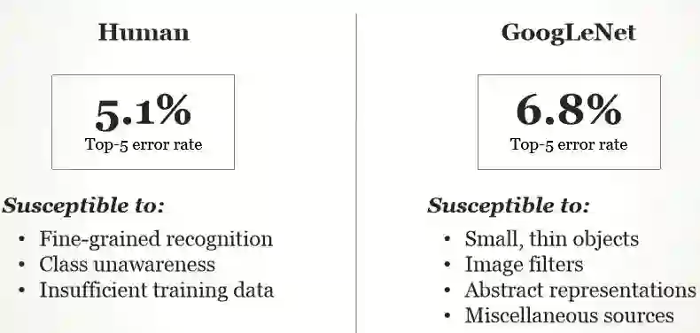 如下所示,相对于 GoogLeNet,Top-5 误差率还是人类高一点,但如果使用近来最先进的模型,人类识别率却不一定比机器高。但识别误差率就是最关键的吗?