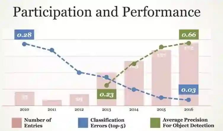 一张图总结 2010-2016 年的 ImageNet 挑战赛成果:分类错误率从 0.28 降到了 0.03;物体识别的平均准确率从 0.23 上升到了 0.66。