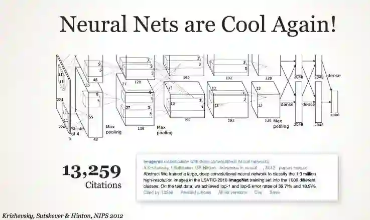 除此之外,还取得了一些意料之外的成果:神经网络再一次流行起来,并且越来越流行。演讲者举例进行了说明。在使用深度卷积神经网络进行 ImageNet 分类任务中,有一篇成果显著的论文,即《imagenet classification with deep convolutional neural networks》(Krizhevsky, Sutskever & Hinton, NIPS 2012),该论文摘要如下:我们训练了一个大型的深度卷积神经网络,把 ILSVRC 2010 训练集中的 130 万高分辨率图像分为了 1000 个不同的类别。在测试数据中,我们获得了 top1 和 top 5 的误差率,分别是 39.7\% 和 18.9\%。该论文的引用数量为 13259,神经网络之火热可见一斑。同时演讲者还给出了该深度卷积神经网络的图示。