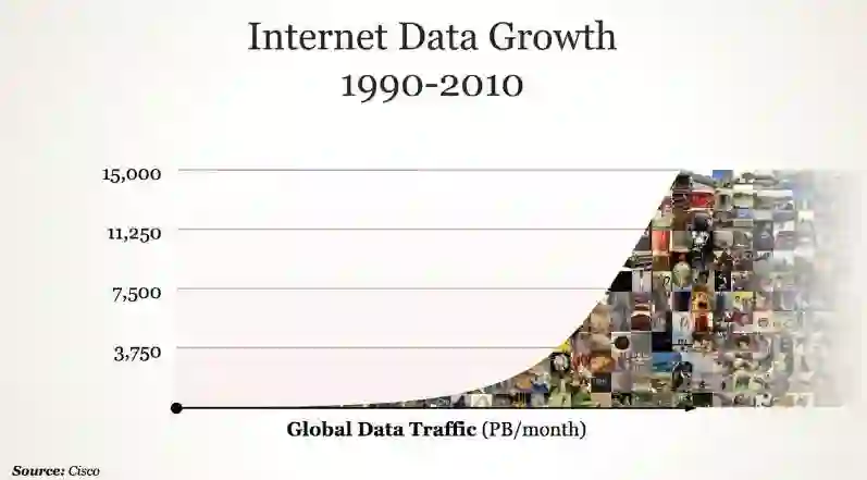 从 1990 年开始到 2010 年,互联网数据的量级有了极大的增长,满足了发展机器学习的数据需求。