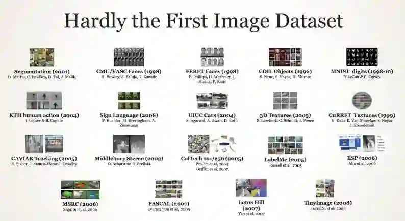 在演讲中,演讲者首先介绍了 2009 年之前的图像数据集历史:从 1998 年 CMU 的 Vasc Faces 到 2008 年的 TinyImage 数据集。