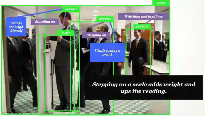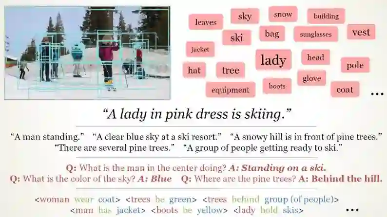 不仅如此,目前的技术已经可以实现对一张复杂照片中的内容进行自然语言描述,并回答相应问题了。这说明深度学习可以理解图片中的内容,并将其转化为可掌握的知识。虽然这一过程还非常基础,但这有助于拉近机器与人类的距离。图像描述一般也有专用的数据集,例如 Visual Genome Dataset 等。该数据集如下有 4.2M 的图像描述和 1.5M 的关系标注,它是基于目标分类实现关系和情景推理的优秀数据集。ImageNet 的下一步很可能就要传递给这些开放、大规模、详细的数据集。