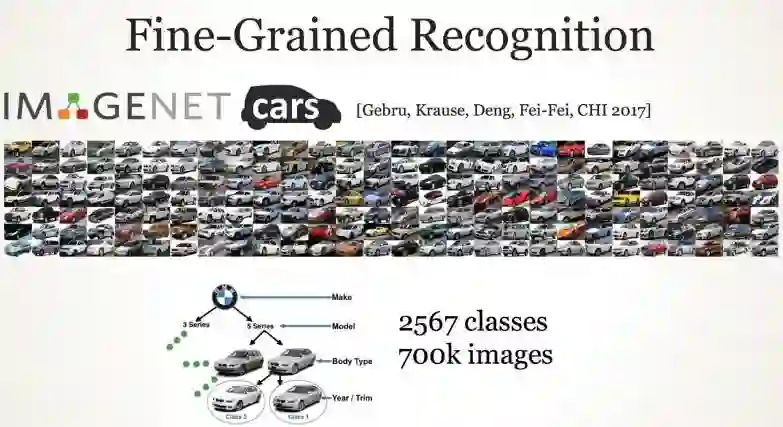 细粒度识别。ImageNet 关于汽车的数据集中,汽车图像的数量达到了 70 万张,类别数量为 2567 个。