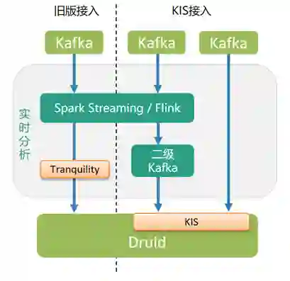 Kafka Indexing Service [3]是为 Kafka 数据源设计的索引服务,可以保证消息摄入的 Exactly Once 语义,由Kafka索引任务直接从Kafka数据源读取消息写入Druid。Kafka索引任务的启动和生命周期管理由运行在Overlord上的Supervisor进行管理,Overlord是Druid上负责接受任务,协调任务分配,创建任务间的锁和返回给调用方任务状态的进程。每个Druid数据源对应一个Supervisor,只需向Overlord提交一个配置文件启动Supervisor,即可实现将Kafka数据摄入至Druid,唯一的条件是使用KIS的Kafka数据源版本必须在0.10.x及以上。当使用KIS接入Druid时,可以使用一些Tranquility接入不支持的高级功能,如更精确的独立计数HLL Sketch [4]等。