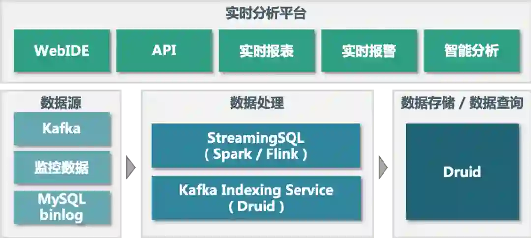 根据典型场景的需求,我们综合评估了常见的几款OLAP引擎,最终选择Druid(Druid是一款开源的为时序数据设计的亚秒级查询延迟的数据存储引擎,主要用于进行OLAP聚合分析。)做为RAP的底层OLAP引擎。针对实时聚合分析场景(绝大部分是时序数据),Druid是更适合使用的数据引擎。基于Druid,我们设计了第一代的实时分析平台 RAP。