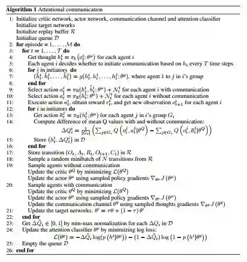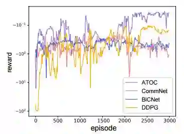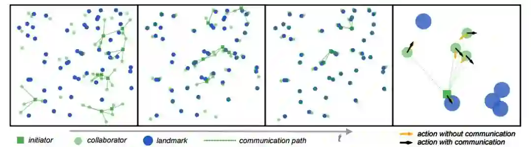 本论文研究者认为解决该问题的关键在于通信,这可以增强策略间的协调。MARL 中有一些学习通信的方法,包括 DIAL [3]、CommNet [23]、BiCNet [18] 和 master-slave [7]。然而,现有方法所采用的智能体之间共享的信息或是预定义的通信架构是有问题的。当存在大量智能体时,智能体很难从全局共享的信息中区分出有助于协同决策的有价值的信息,因此通信几乎毫无帮助甚至可能危及协同学习。此外,在实际应用中,由于接收大量信息需要大量的带宽从而引起长时间的延迟和高计算复杂度,因此所有智能体之间彼此的通信是十分昂贵的。像 master-slave [7] 这样的预定义通信架构可能有所帮助,但是它们限定特定智能体之间的通信,因而限制了潜在的合作可能性。