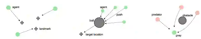 图 2:实验场景图示:协作导航(左)、协作推球(中)、捕食者-猎物(右)。