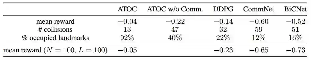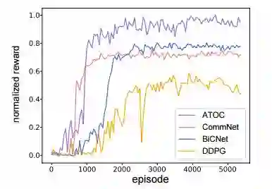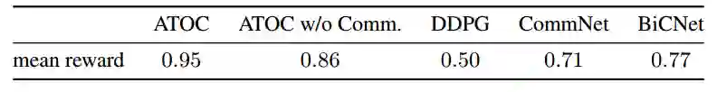 研究者将 ATOC 实现为端到端训练的 actor-critic 模型的扩展。在测试阶段,所有智能体共享策略网络、注意力单元和信道,因此 ATOC 在大量智能体的情况下具备很好的扩展性。研究者在三个场景中通过实验展示了 ATOC 的成功,分别对应于局部奖励、共享全局奖励和竞争性奖励下的智能体协作。与现有的方法相比,ATOC 智能体被证明能够开发出更协调复杂的策略,并具备更好的可扩展性(即在测试阶段添加更多智能体)。据研究者所知,这是注意力通信首次成功地应用于 MARL。