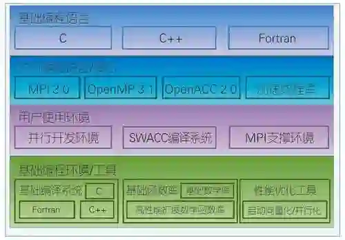 神威·太湖之光计算机系统支持主流的基础编程语言,满足实际课题编译需求,支持MPI3.0、OpenMP3.1、Pthreads、OpenACC2.0等与国际接轨的并行编程标准,以及消息并行编程模型、共享并行编程模型和加速并行编程模型,能够满足科学与工程计算课题开发和移植的多样性需要。