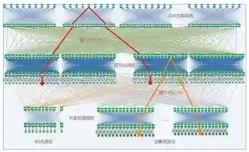 为满足数万个节点规模下通信密集课题和I/O密集课题的不同性能要求,神威·太湖之光研制者提出了一种由超节点网络、共享资源网络和中央交换网络组成的高流量可扩展复合网络结构,实现了全机40960个运算节点和240个I/O节点的高带宽低延迟通信,最大通信步长仅7步,系统对分带宽70TB/s。