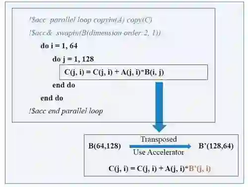 其次,扩充了两种优化的数据传输控制子句,分别是swap/swapin/swapout和pack/packin/packout,二者都是通过数据变换来提升数据传输效率的有效手段。Swap系列子句主要用来处理某些访问方式不连续的数组数据的拷贝,先将这些数组转置,然后通过连续的数据传输操作进行传输,以提高数据传输的效率,具体用法见图7。